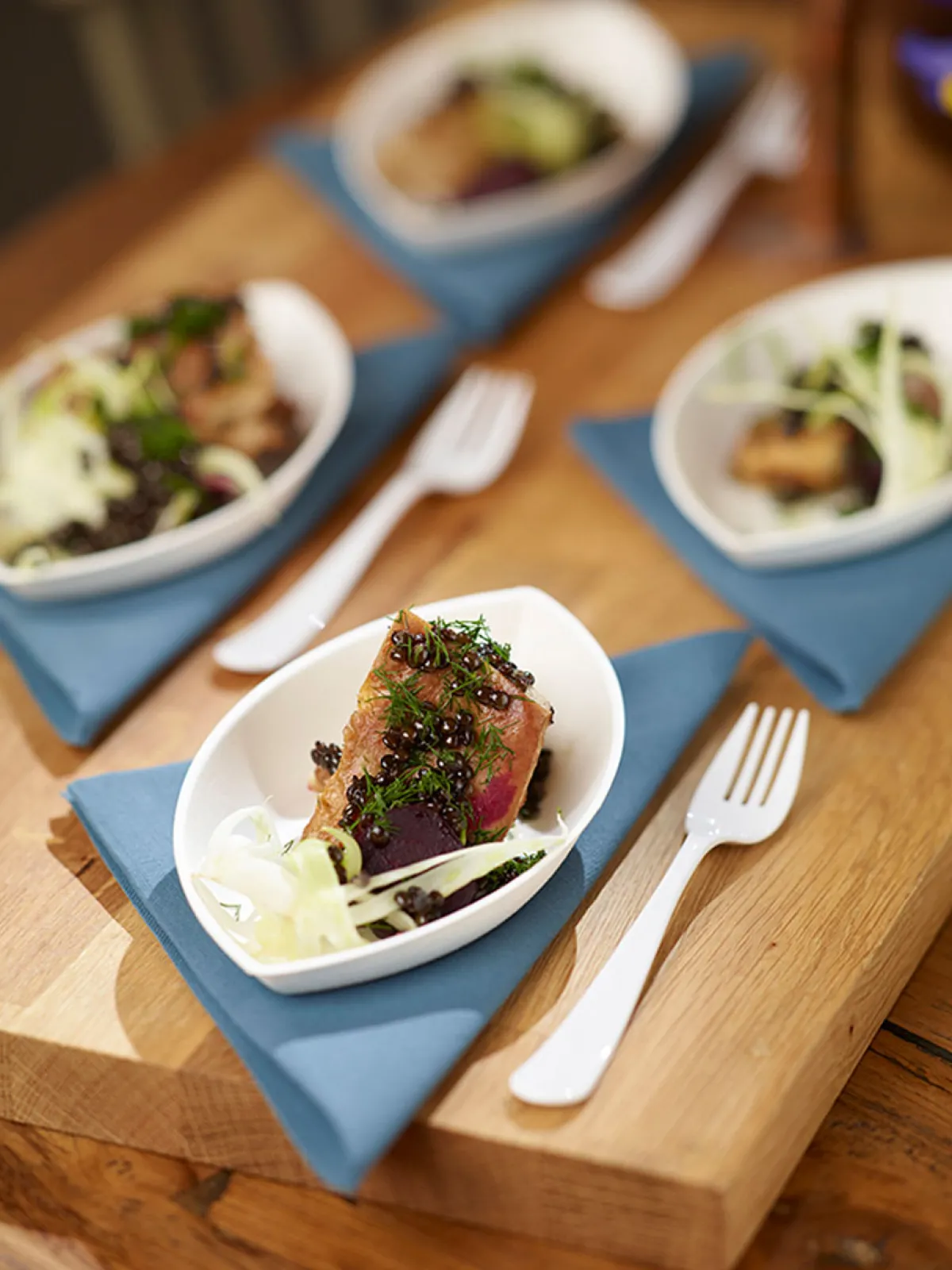 Unsere kristallklaren Duni Amuse-bouche®-Lösungen unterstreichen die Schönheit Ihrer kulinarischen Kreationen und ermöglichen eine perfekte Speisenpräsentation. Und nicht nur das… Das Design der Behälter ist auch besonders praktisch und vereinfacht das Handling. Dank der Portionsgrößen haben Sie den Überblick, was Ihre Gäste essen – und können schneller servieren und abräumen. Das Ergebnis? Sie können förmlich das Funkeln in den Augen Ihrer Gäste sehen, während Sie Ihre Leckereien servieren.