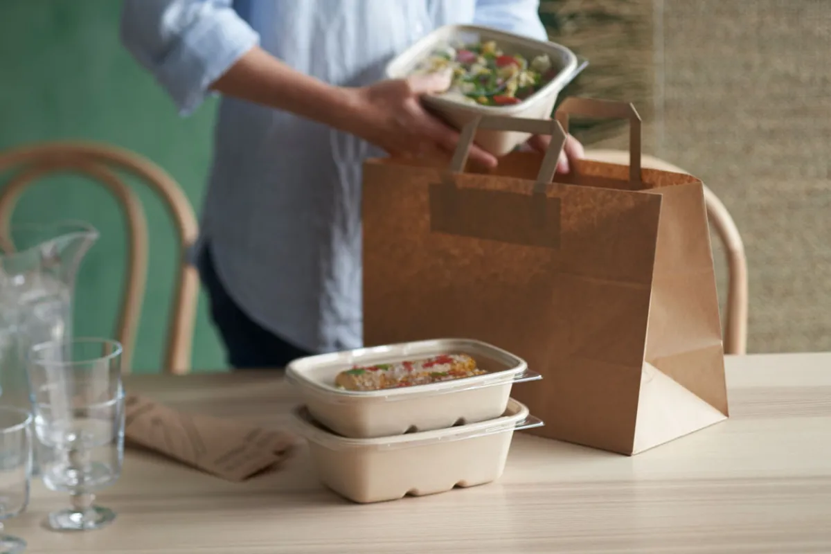 • Boxen und Zuckerrohrfaser-Deckel aus nachwachsenden Rohstoffen