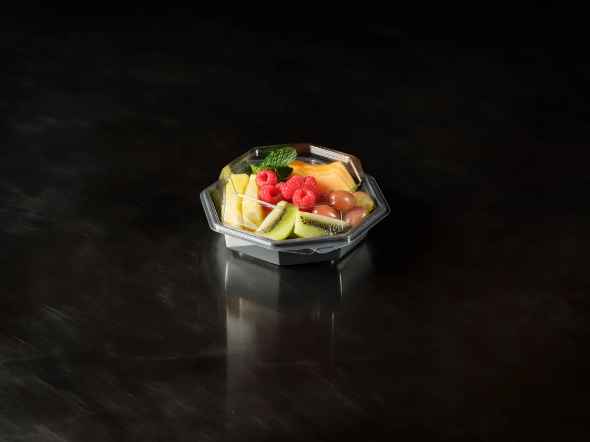 Die Octaview-Take-away-Box schützt frische, kalte Speisen und präsentiert sie gleichzeitig optimal – aus Respekt vor den Lebensmitteln und den Menschen, die sie zubereiten. Sie wurde für Lebensmitteleinzelhändler, Caterer und Feinkosttheken entwickelt und verfügt über einen kristallklaren, beschlagfreien Deckel und einen großen, dunkelgrauen Bereich, der Salate, Sushi, Meeresfrüchte und Wurstwaren hochwertig in Szene setzt. Octaview wird aus APET ohne Ruß hergestellt und reduziert die CO₂-Emissionen um bis zu 78 % über die gesamte Produktpalette hinweg*, wodurch die Sorgfalt im Umgang mit Lebensmitteln mit einer geringeren Umweltbelastung verbunden wird.