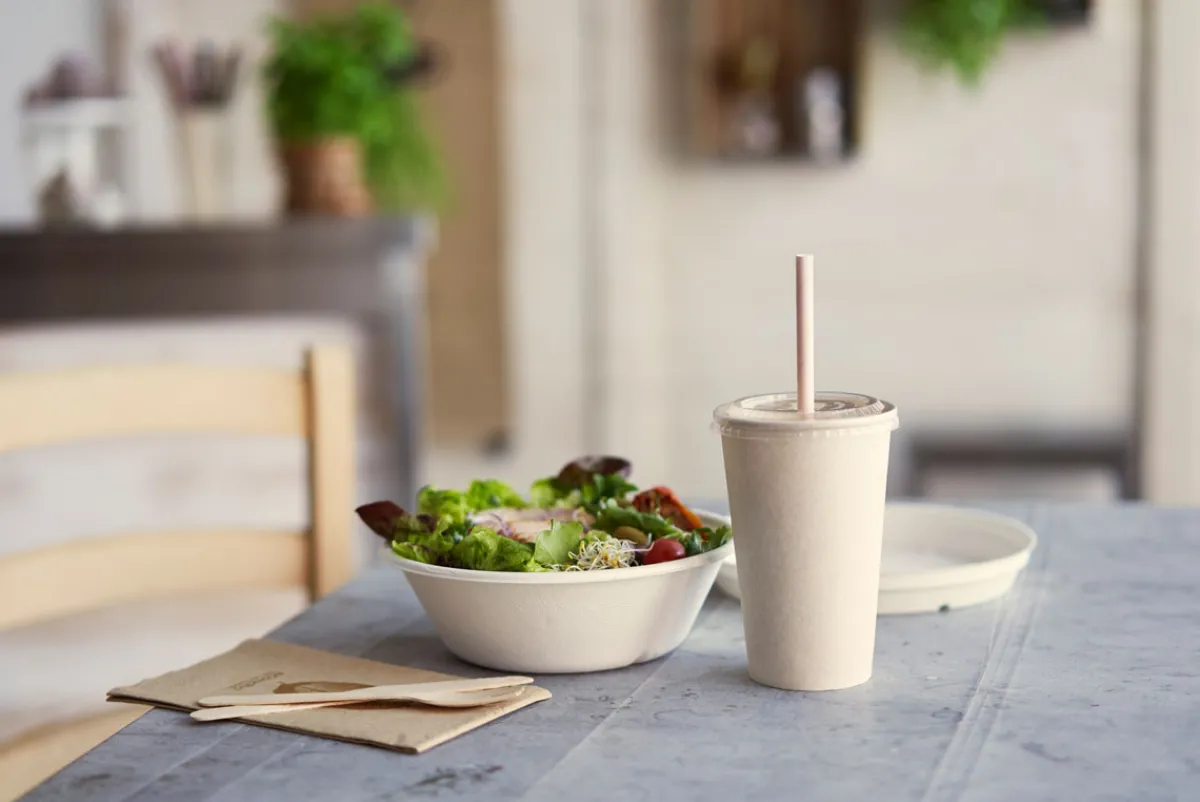 • Becher, CPLA-Deckel und Zuckerrohrfaser-Deckel aus nachwachsendem Material