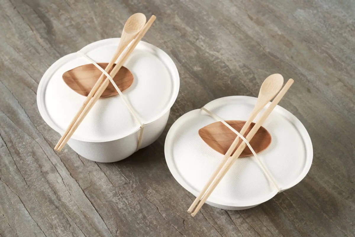 • Schalen und Zuckerrohrfaser-Deckel aus nachwachsendem Material