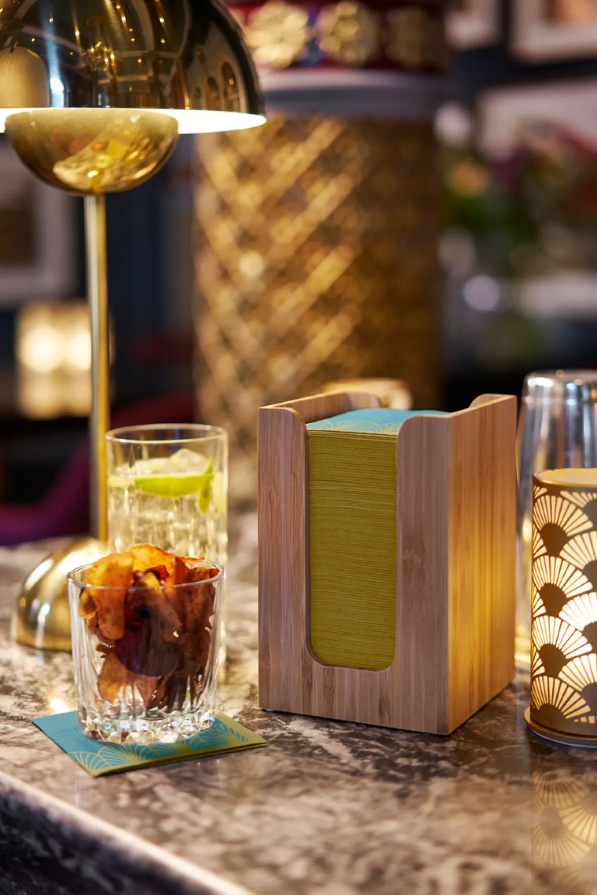 Platzsparend, ideal für Theken und Bars, verhindert Verschwendung von Servietten. Praktische Platzwunder. In den flexiblen Fächern finden Servietten, Besteck, Salz und Pfeffer etc. problemlos ihren Platz. Hergestellt aus umweltfreundlichem und stylischem Bambus.