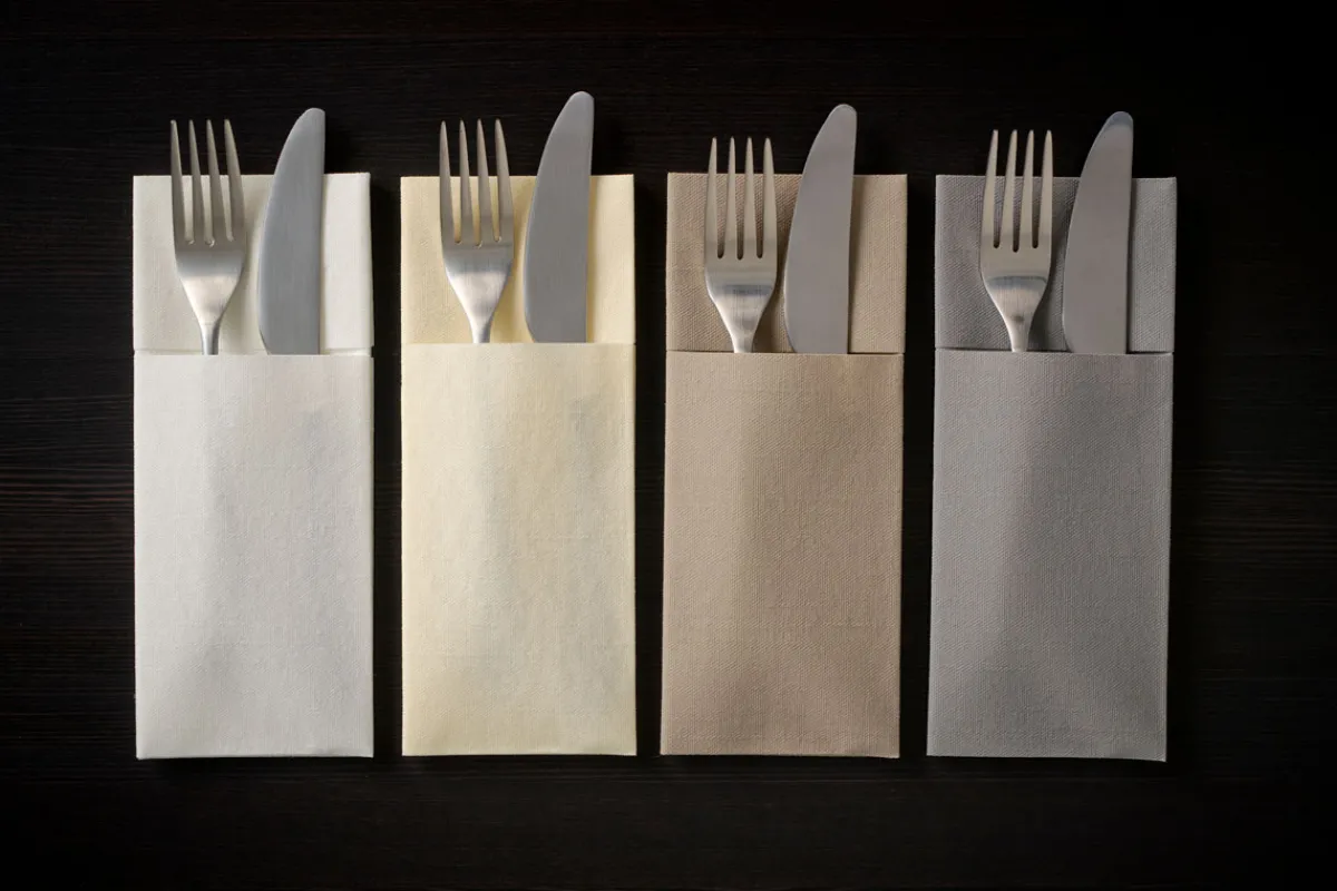 Hygienische und praktische Serviettentaschen. Eine praktische und simple Lösung, um das Besteck- und Servietten-Handling zu vereinfachen. Schnell und einfach vorbereitet und eingedeckt – auch in Stoßzeiten. Tolle Lösung für den Innen- und Außenbereich. In Optik und Haptik nicht von Stoff zu unterscheiden. Elegant geprägt, weich und dick. Kompostierbar.