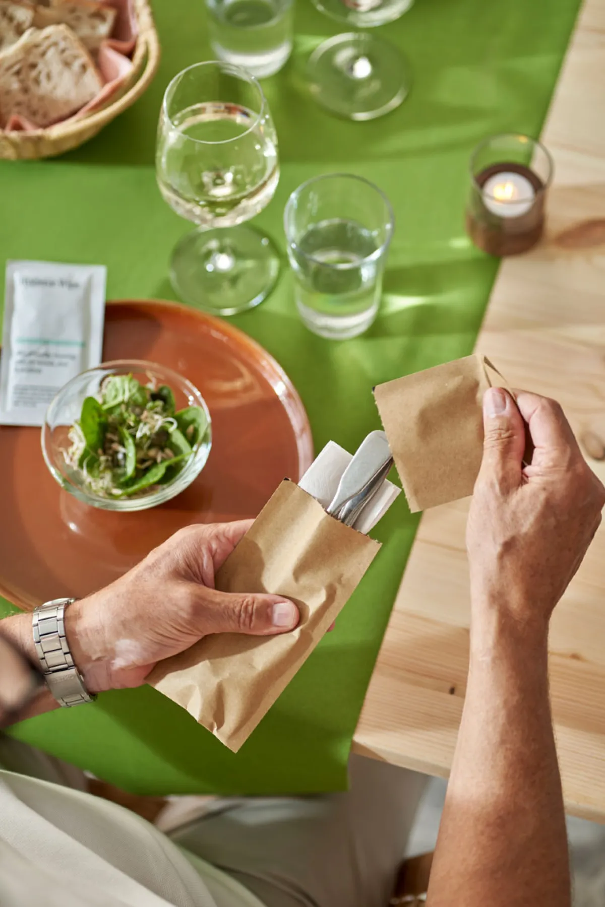 Hygienische und praktische Serviettentaschen. Eine praktische und simple Lösung, um das Besteck- und Servietten-Handling zu vereinfachen. Schnell und einfach vorbereitet und eingedeckt – auch in Stoßzeiten. Tolle Lösung für den Innen- und Außenbereich. Unsere neueste Sacchetto-Bestecktasche – Sacchetto mit Hygienesiegel – geht noch einen Schritt weiter. Sie halten Besteck & Serviette sauber und sind ein sichtbares Hygienezeichen für die Gäste. Enthält eine 2-lagige, kompostierbare Zelltuch-Serviette (33 × 33 cm).