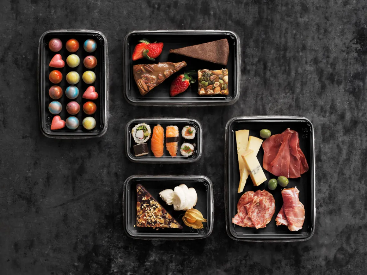 Machen Sie Sushi, Feinkost und Backwaren mit Tray Contrast unübersehbar – einem Papier-Takeaway-Tablett, das Ihre Speisen perfekt in Szene setzt. Der schwarze Karton sorgt für einen Kontrast, der Farben, Texturen und Frische hervorhebt und die Speisen auf den ersten Blick hochwertiger und appetitlicher erscheinen lässt. Kombinieren Sie es mit dem kristallklaren, gewölbten Deckel, um die Sichtbarkeit in jeder Thekenauslage zu maximieren. Tray Contrast wird aus recycelbarem Material ohne Zusatz von PFAS hergestellt und ist somit eine nachhaltige Wahl für Fast-Casual-Restaurants und Lebensmitteleinzelhändler.