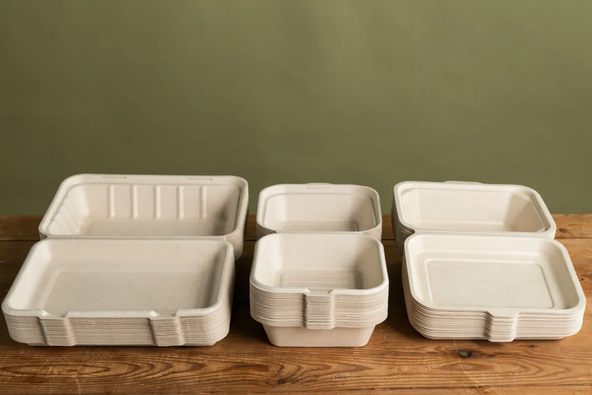 Unsere Boxen mit anhängendem Klappdeckel sind die optimale Wahl für Fast-Food. Sie werden aus erneuerbaren und kompostierbaren Zuckerrohrfasern (Bagasse) hergestellt und sind ebenso nachhaltig wie praktisch. Es gibt sie in verschiedenen Größen und mit unterschiedlichen Fachgrößen, was Zubereitung und Servieren denkbar einfach macht. Unsere Speiseverpackungen – wie all unsere Boxen und Schalen – werden ohne Zusatz von PFAS hergestellt.
