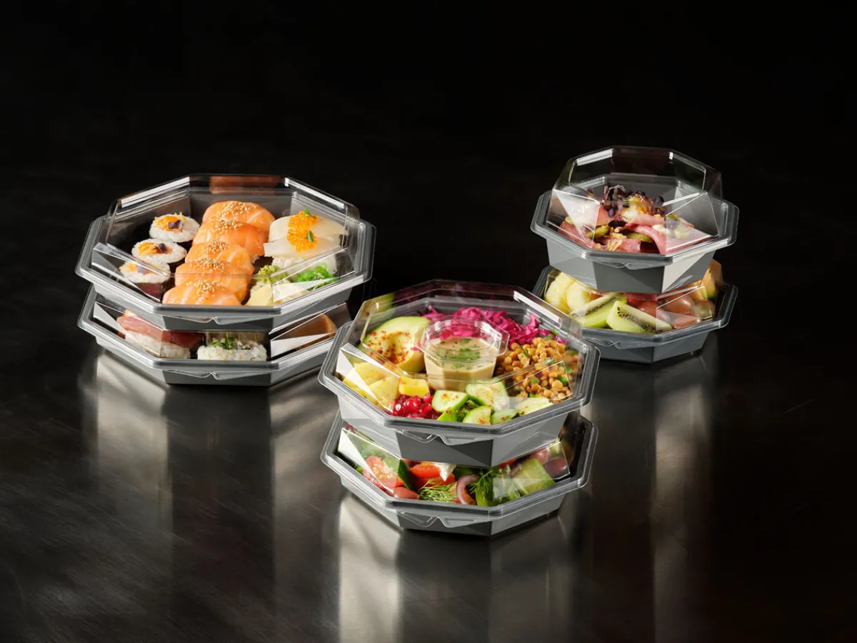 Die Octaview-Take-away-Box schützt frische, kalte Speisen und präsentiert sie gleichzeitig optimal – aus Respekt vor den Lebensmitteln und den Menschen, die sie zubereiten. Sie wurde für Lebensmitteleinzelhändler, Caterer und Feinkosttheken entwickelt und verfügt über einen kristallklaren, beschlagfreien Deckel und einen großen, dunkelgrauen Bereich, der Salate, Sushi, Meeresfrüchte und Wurstwaren hochwertig in Szene setzt. Octaview wird aus APET ohne Ruß hergestellt und reduziert die CO₂-Emissionen um bis zu 78 % über die gesamte Produktpalette hinweg*, wodurch die Sorgfalt im Umgang mit Lebensmitteln mit einer geringeren Umweltbelastung verbunden wird.