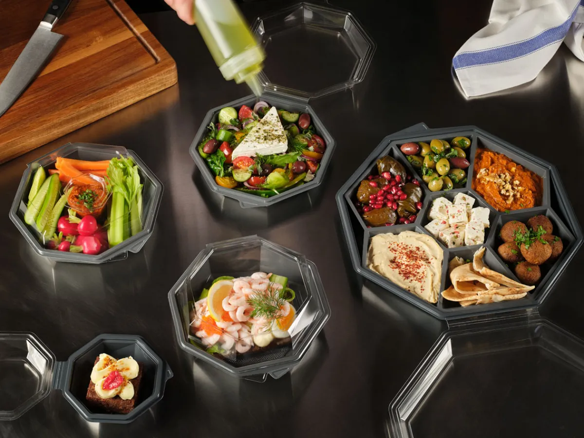 Die Octaview-Take-away-Box schützt frische, kalte Speisen und präsentiert sie gleichzeitig optimal – aus Respekt vor den Lebensmitteln und den Menschen, die sie zubereiten. Sie wurde für Lebensmitteleinzelhändler, Caterer und Feinkosttheken entwickelt und verfügt über einen kristallklaren, beschlagfreien Deckel und einen großen, dunkelgrauen Bereich, der Salate, Sushi, Meeresfrüchte und Wurstwaren hochwertig in Szene setzt. Octaview wird aus APET ohne Ruß hergestellt und reduziert die CO₂-Emissionen um bis zu 78 % über die gesamte Produktpalette hinweg*, wodurch die Sorgfalt im Umgang mit Lebensmitteln mit einer geringeren Umweltbelastung verbunden wird.