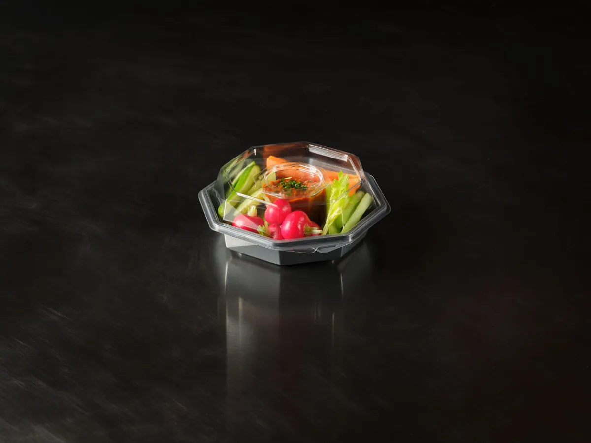 Die Octaview-Take-away-Box schützt frische, kalte Speisen und präsentiert sie gleichzeitig optimal – aus Respekt vor den Lebensmitteln und den Menschen, die sie zubereiten. Sie wurde für Lebensmitteleinzelhändler, Caterer und Feinkosttheken entwickelt und verfügt über einen kristallklaren, beschlagfreien Deckel und einen großen, dunkelgrauen Bereich, der Salate, Sushi, Meeresfrüchte und Wurstwaren hochwertig in Szene setzt. Octaview wird aus APET ohne Ruß hergestellt und reduziert die CO₂-Emissionen um bis zu 78 % über die gesamte Produktpalette hinweg*, wodurch die Sorgfalt im Umgang mit Lebensmitteln mit einer geringeren Umweltbelastung verbunden wird.