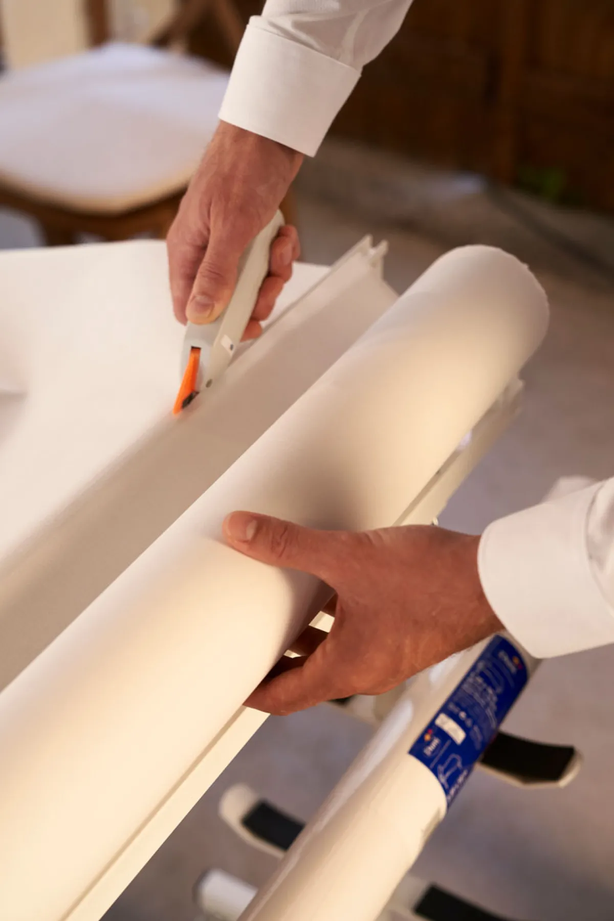 Bequeme und einfache Möglichkeit, um Tischdeckenrollen zu schneiden